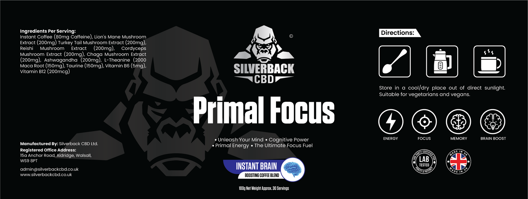 Instant Coffee, Lion's Mane Mushroom Extract, Turkey Tail Mushroom Extract, Reishi Mushroom Extract, Cordyceps Mushroom Extract, Chaga Mushroom Extract, Ashwagandha, L-Theanine, Maca Root, Taurine, Vitamin B6, Vitamin B12