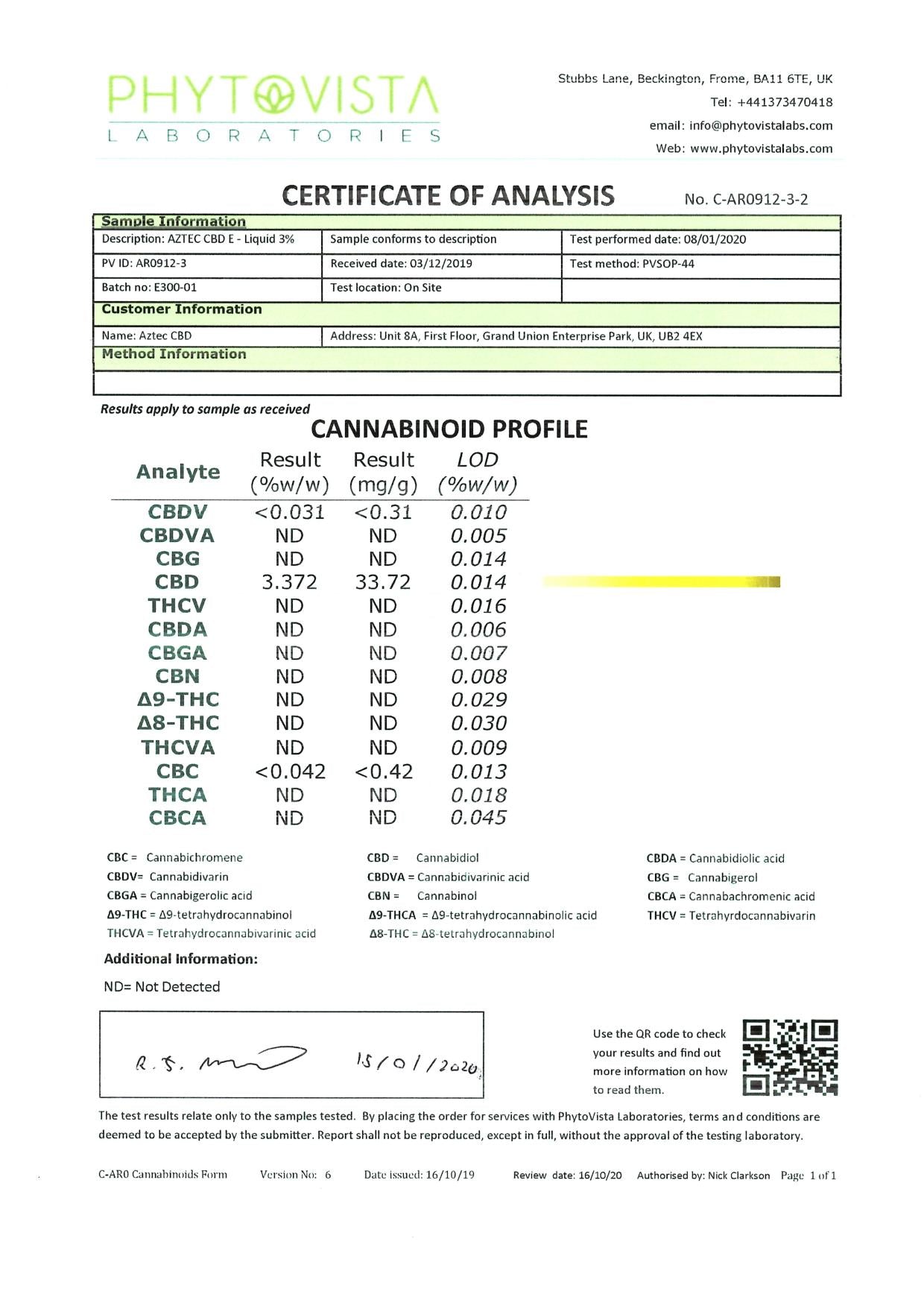 CBD (cannabidiol) is an active substance found in hemp oil. It is perfectly legal and safe to use. CBD has no side effects and is not addictive. Aztec CBD e liquid is non-psychoactive and the content of THC is tested on every batch to meet specification requirements of less than 0.05%.